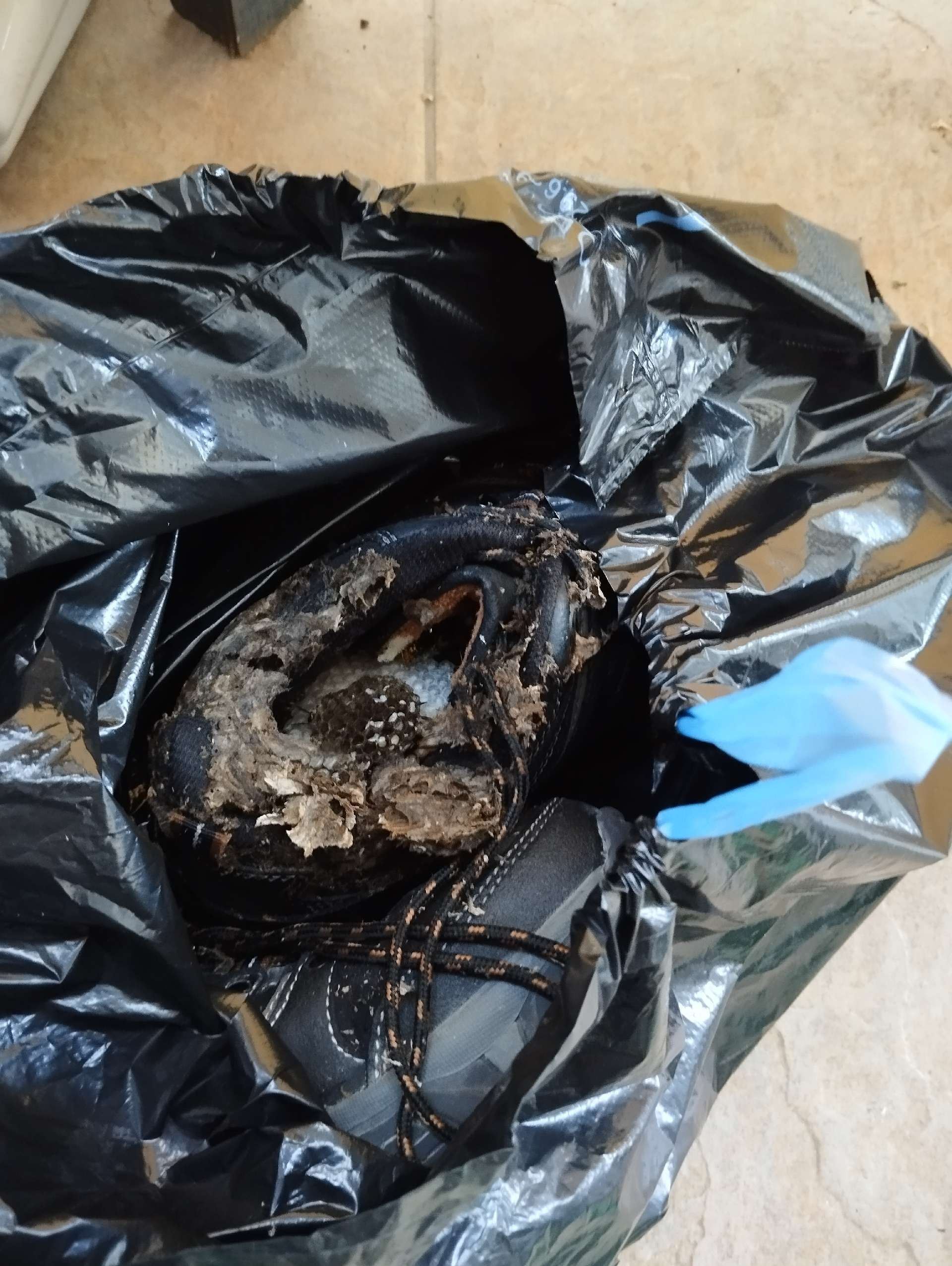 5. Nest: The Asian hornet's nest is often high in the trees, but it can also be found underground or in tall structures such as chimneys. It has an oval shape and is made of chewed wood, which gives the hornet a papery texture.