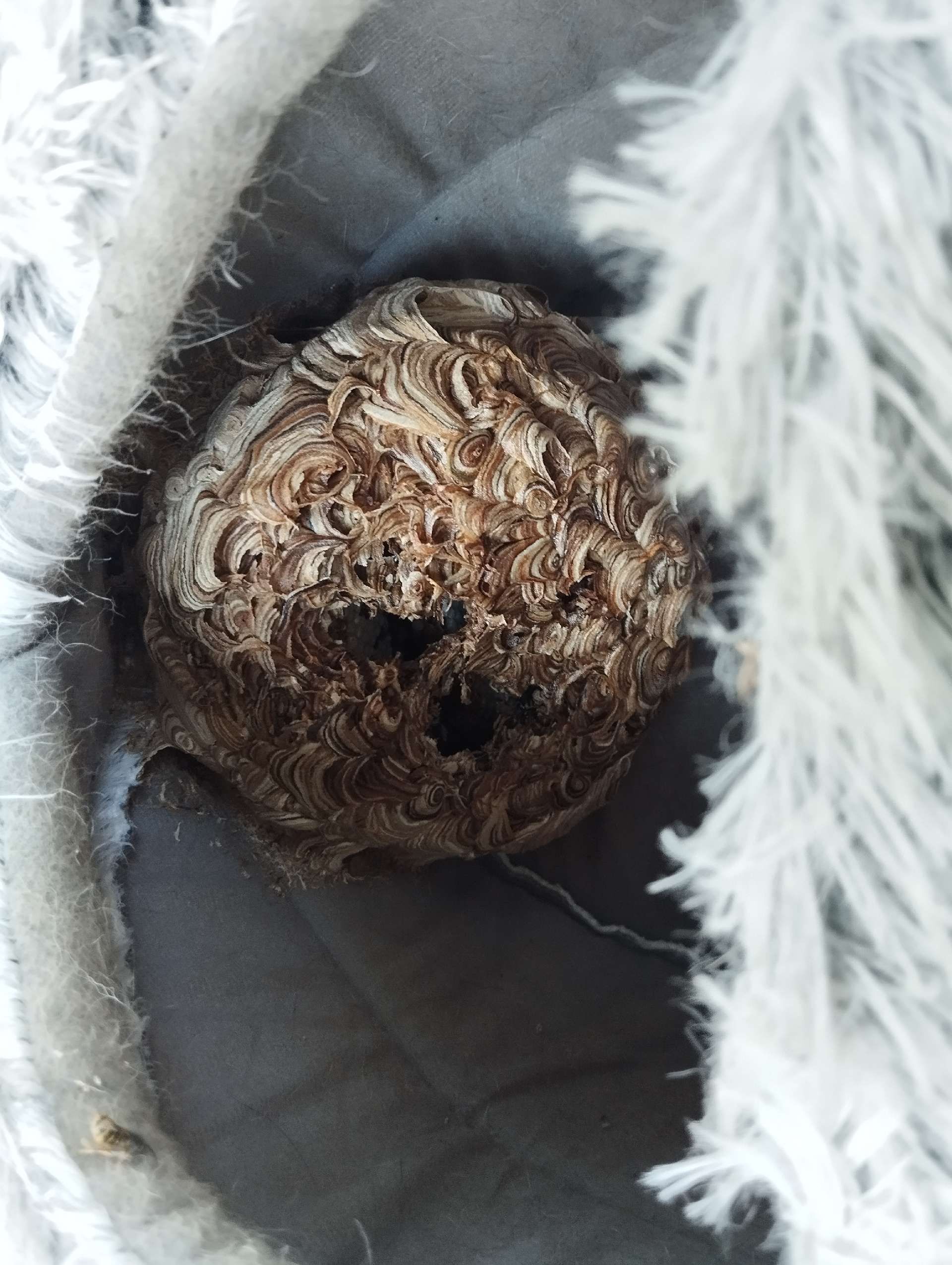5. Nest: The Asian hornet's nest is often high in the trees, but it can also be found underground or in tall structures such as chimneys. It has an oval shape and is made of chewed wood, which gives the hornet a papery texture.
