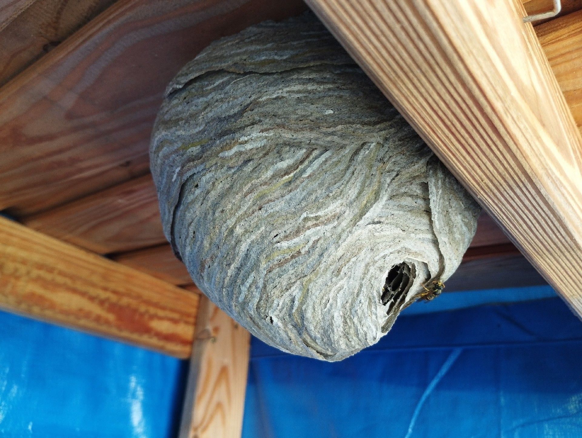 5. Nest: The Asian hornet's nest is often high in the trees, but it can also be found underground or in tall structures such as chimneys. It has an oval shape and is made of chewed wood, which gives the hornet a papery texture.