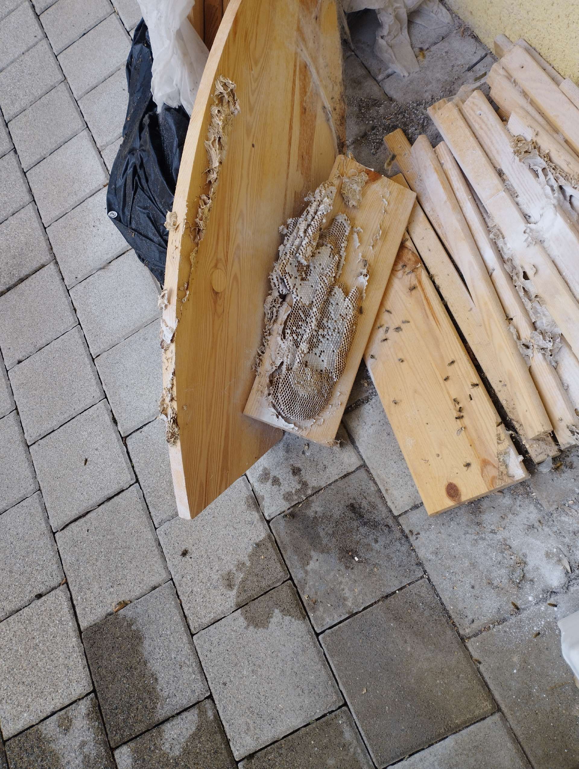 5. Nest: The Asian hornet's nest is often high in the trees, but it can also be found underground or in tall structures such as chimneys. It has an oval shape and is made of chewed wood, which gives the hornet a papery texture.
