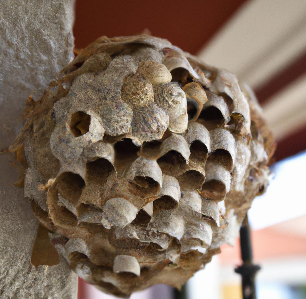 5. Nest: The Asian hornet's nest is often high in the trees, but it can also be found underground or in tall structures such as chimneys. It has an oval shape and is made of chewed wood, which gives the hornet a papery texture.