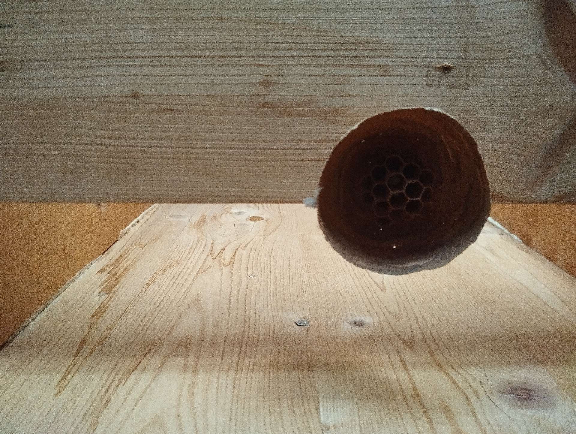 5. Nest: The Asian hornet's nest is often high in the trees, but it can also be found underground or in tall structures such as chimneys. It has an oval shape and is made of chewed wood, which gives the hornet a papery texture.